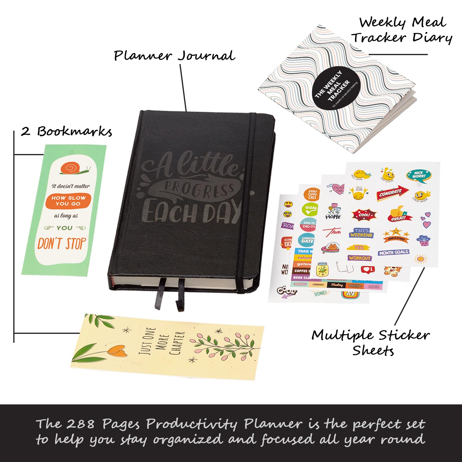 - [EXTRA FEATURES & ACCESSORIES]: The planner includes ribbons, an elastic pen loop, sticker sheets with over 100 stickers | bookmarks.
