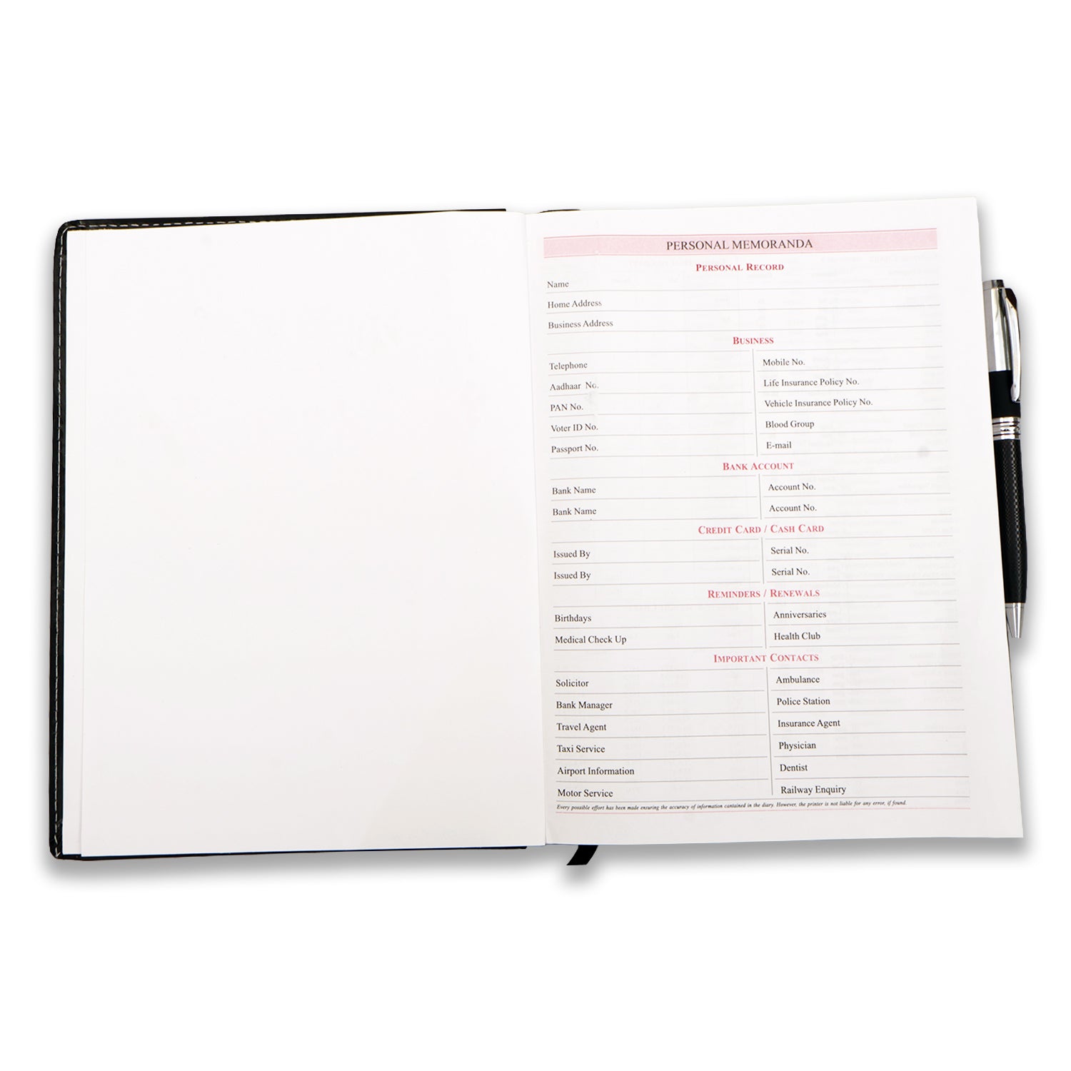 Personal Information Page-1| Health Page-1|Diary Pages -313| SUNDAY HALF| STD-ISD Codes Pages- 2| Calender-2026-2027| World Time Zone-1| List of Holidays -2026.