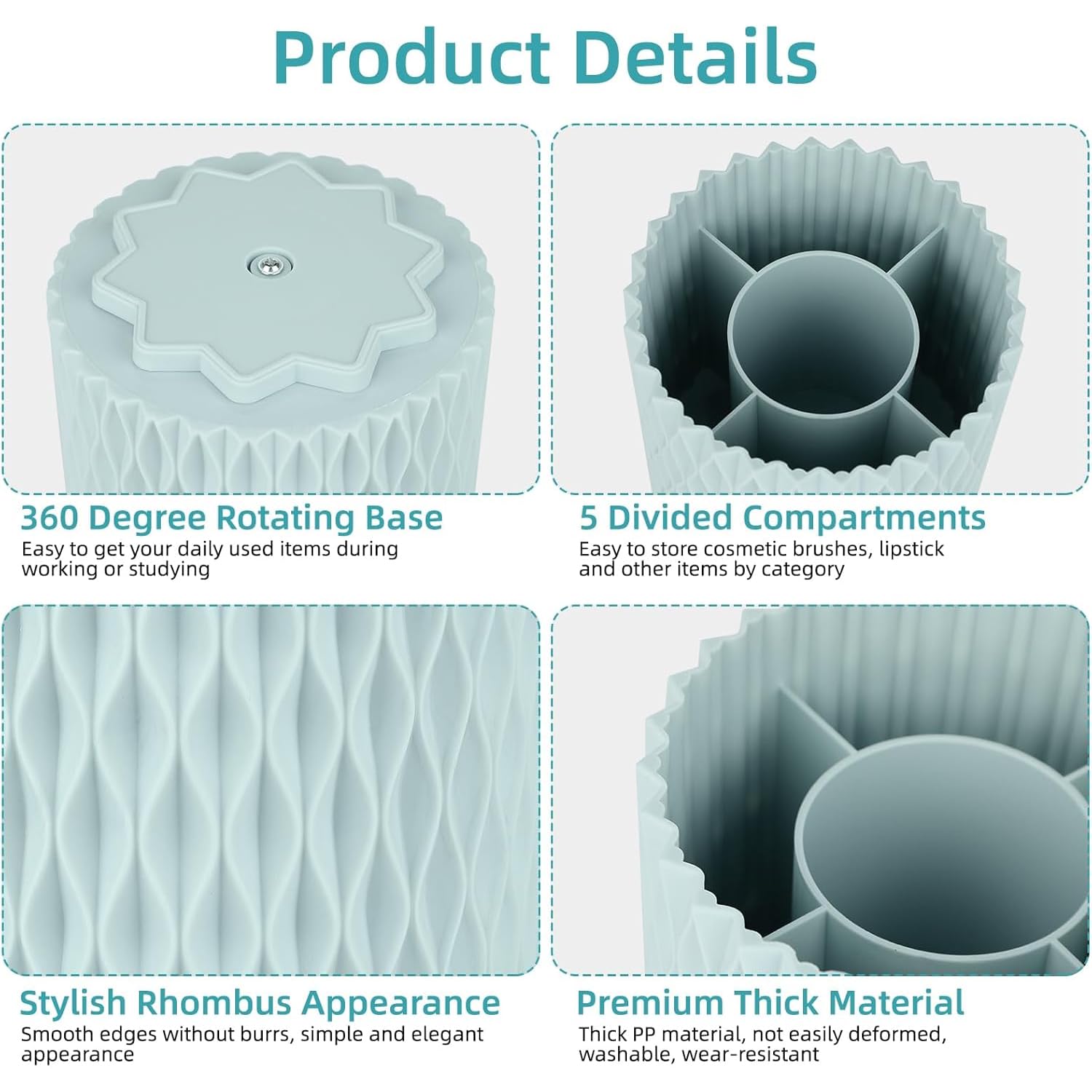 Blue Pen Holder for Desk, 360 Degree Rotating Desk Organizer with 5 Compartments, Pen Pencil Makeup Brush Holder, Cosmetics Lipsticks Pen Organizer for Home Office School